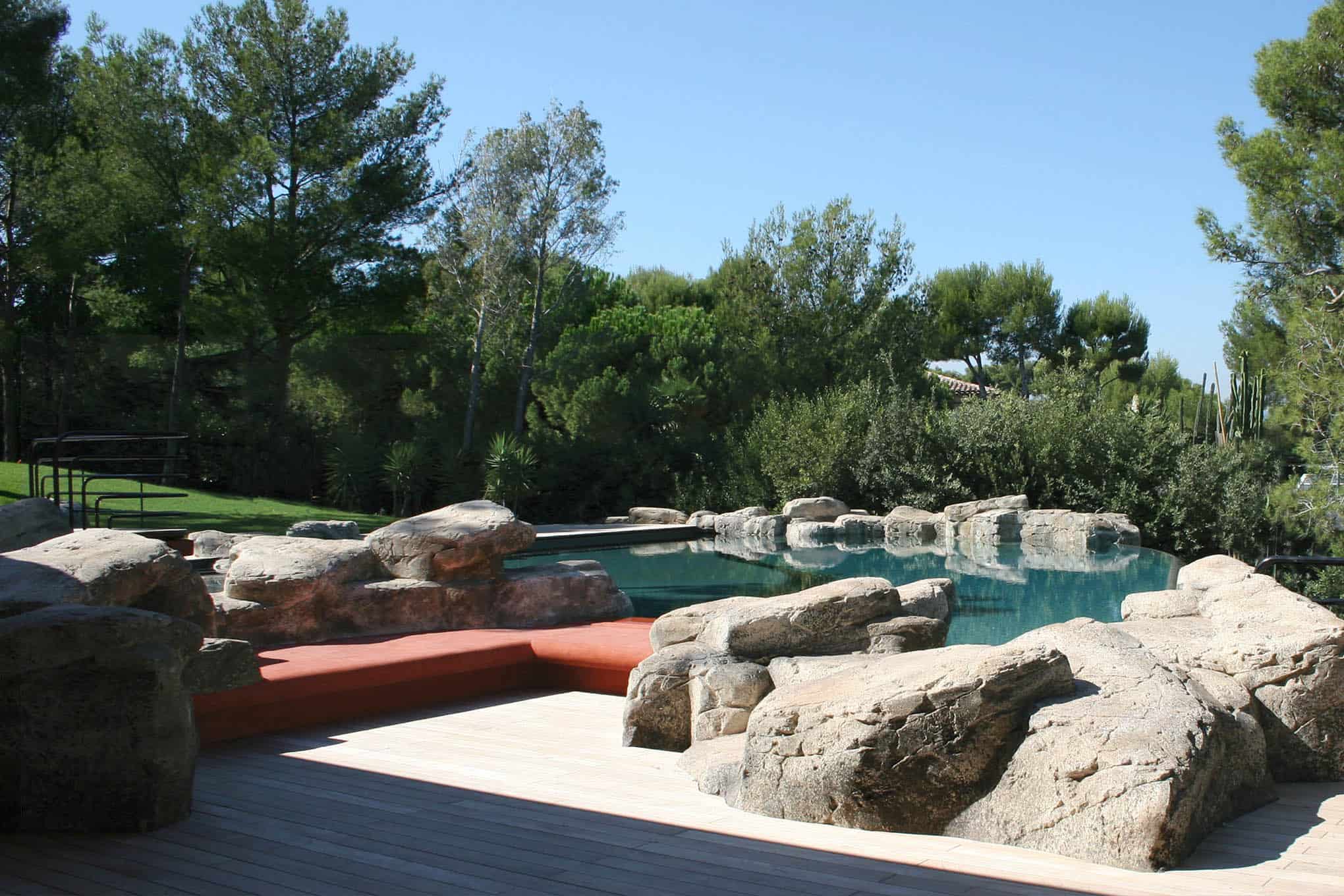 Dans ce projet d’aménagement d’exception, les faux rochers réalisés sur mesure s’intègrent harmonieusement à l’environnement naturel et architectural. Conçus avec un souci du détail remarquable, ces éléments minéraux recréent l’illusion parfaite de la roche naturelle, tout en accompagnant les lignes contemporaines du site. Véritables sculptures paysagères, ils soulignent le caractère unique du lieu, tout en offrant une transition douce entre nature et architecture.