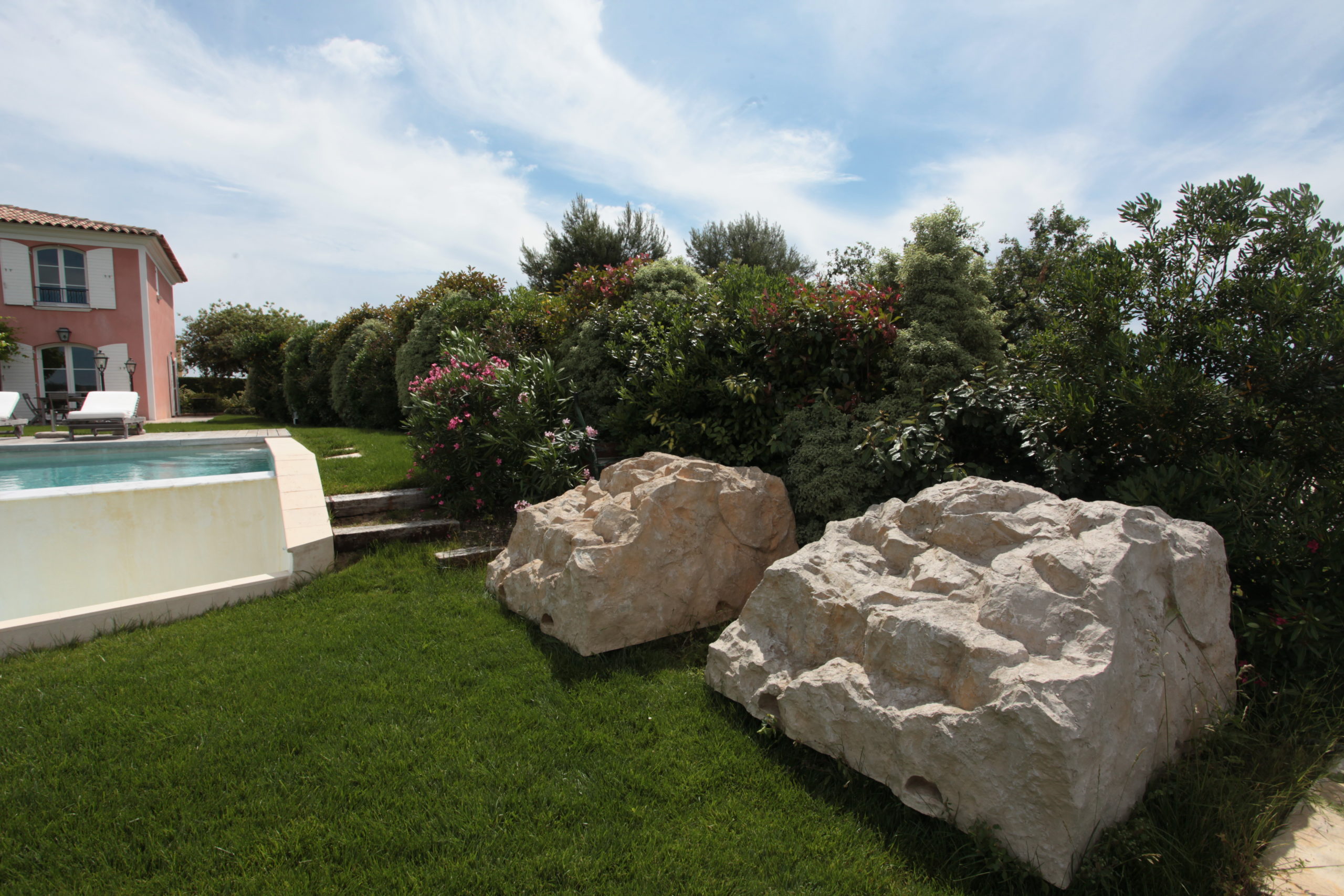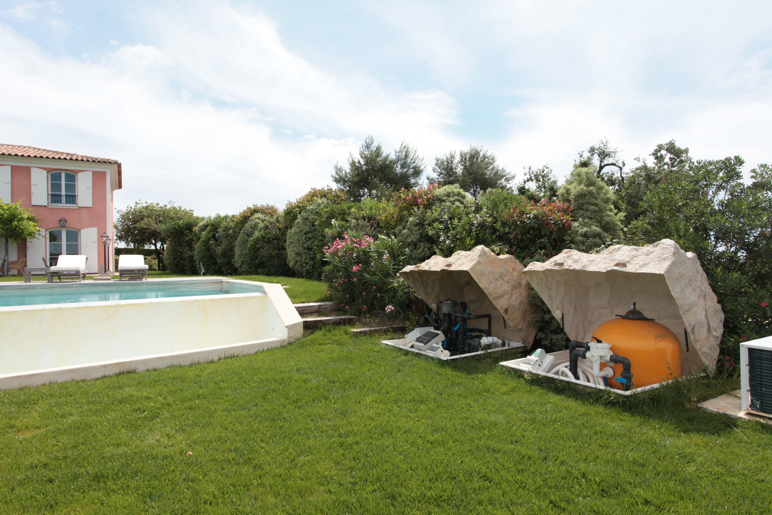 Ces locaux techniques en faux rochers reconstitués, réalisés en polyester, permettent de garder à portée de main toute la logistique nécessaire à l’entretien du bassin.