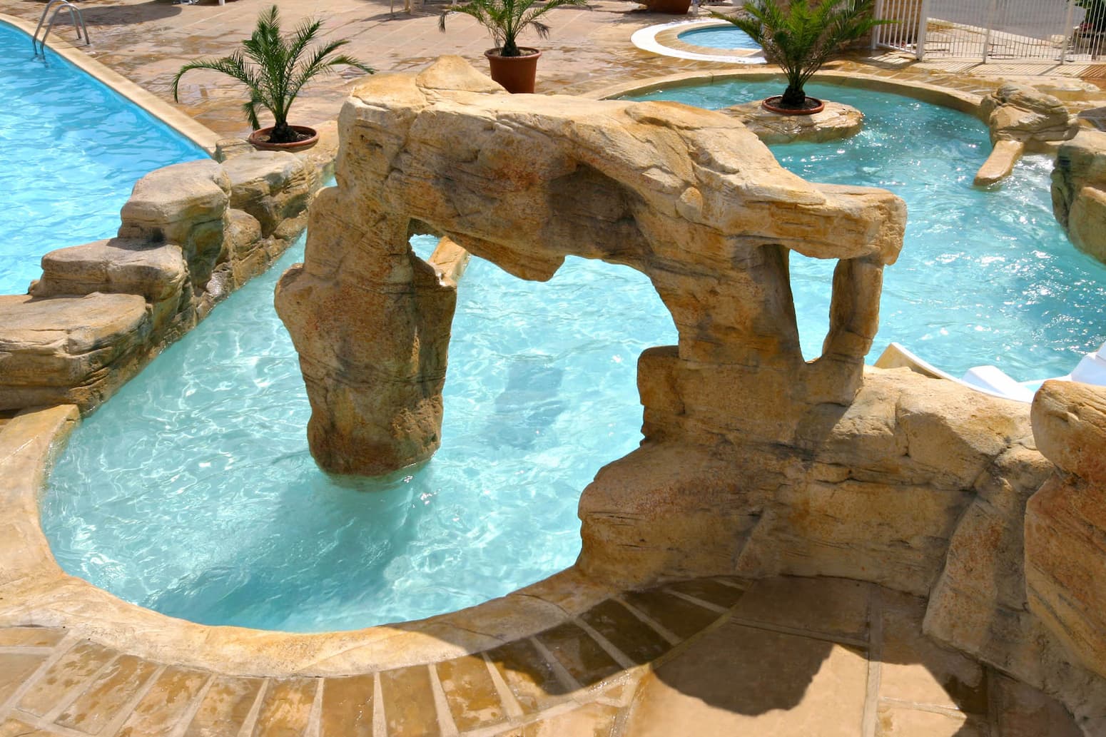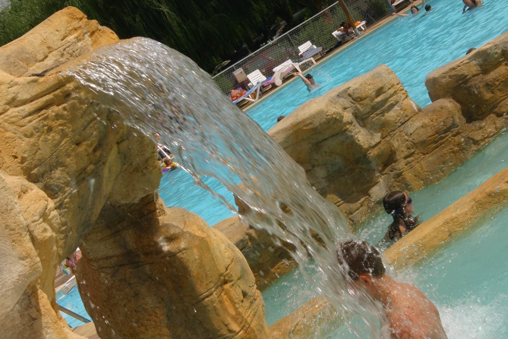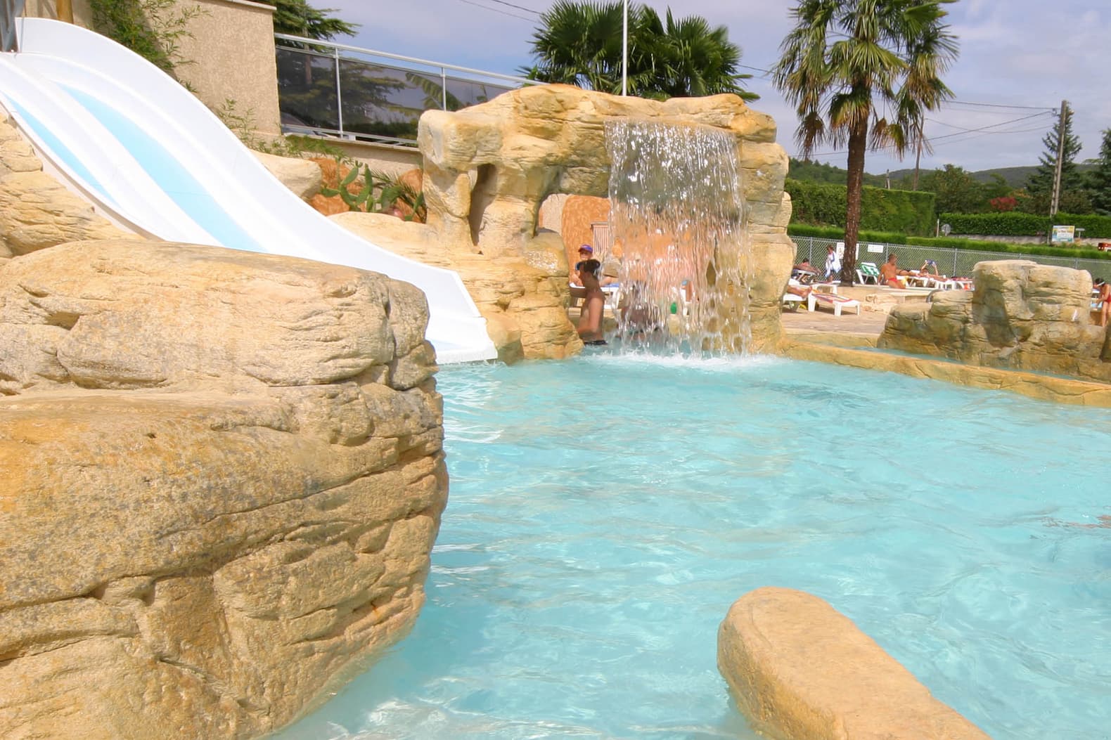 Des faux rochers et des cascades en béton projeté habillent les abords de la piscine, créant un décor naturel et accueillant. Réalisés sur mesure, ces éléments s’intègrent parfaitement à l’espace aquatique, offrant un cadre agréable et apaisant pour les vacanciers.